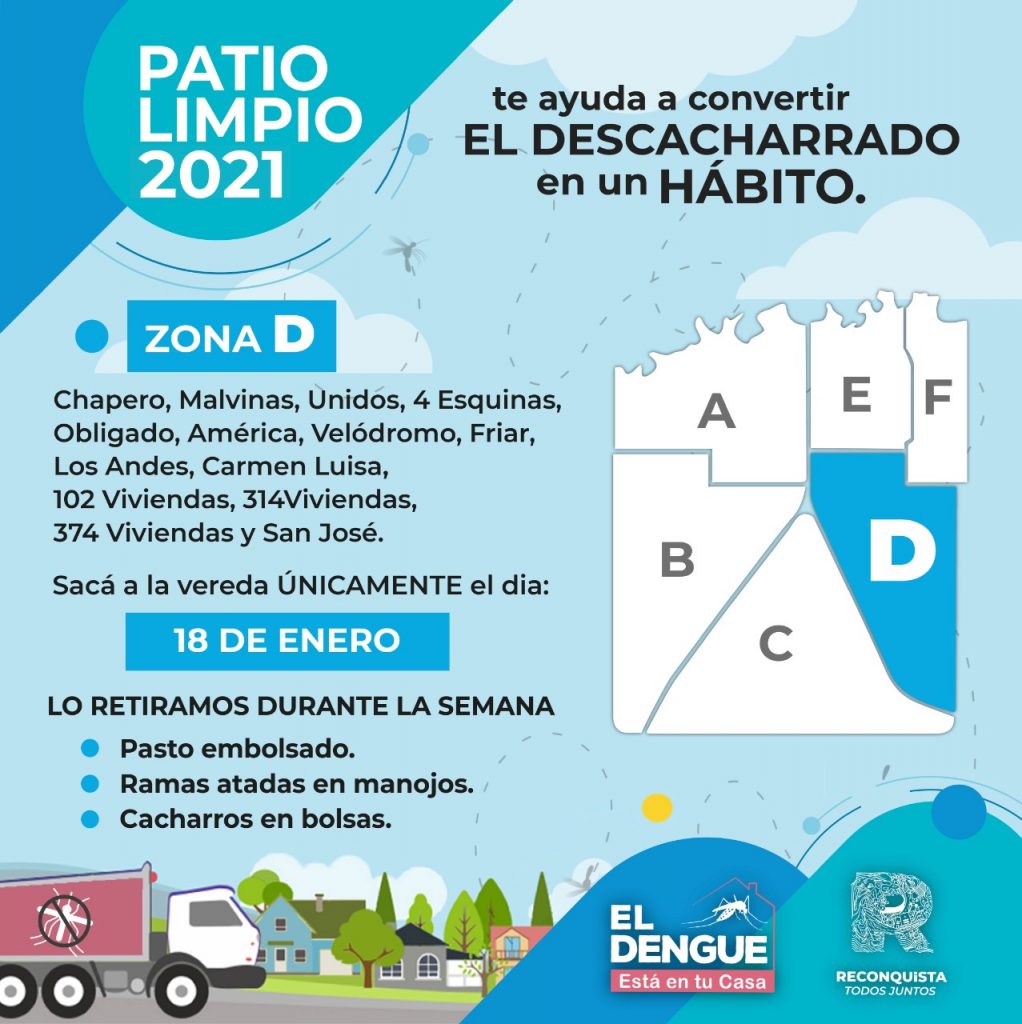En ese sentido, se informa que el próximo lunes 18 de enero será el turno de la Zona D: barrios Chapero, Malvinas, Unidos, 4 Esquinas, Obligado, América, Velódromo, Friar, Los Andes, Carmen Luisa, 102 Viviendas, 314 Viviendas, 374 Viviendas y San José.