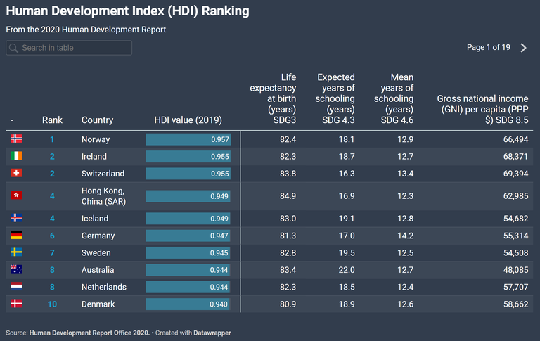 La ONU publicó su Índice de Desarrollo Humano para el 2020 , y junto con él, un ránking anual de 189 estados soberanos elaborado por el Programa para el Desarrollo de las Naciones Unidas, que tiene en cuenta factores como la expectativa de vida al nacer, la media de años de escolaridad de cada persona y los ingresos brutos per cápita. En esa lista, Noruega quedó como el mejor país del mundo para vivir .